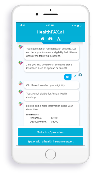 Reduce the burden on your staff by allowing HealthFAX.ai to answer questions and provide real-time test cost estimates and detailed snapshots of a member’s health insurance such as co-pay, deductibles, co-insurance, etc.
